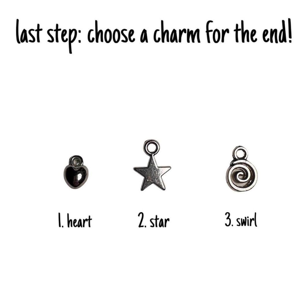 at checkout there is a box to leave a message on your order, please write which 7 charms you'd like there!!! plz don't forget to do this or i won't have a way to contact you about it!! OR you could also dm me your order number and which charms you want on instagram (@karocostuff) :DDD