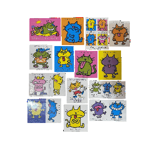 this sticker line was called "just beasty" by jim benton (also made happy bunny!) all are in perfect condition. :) they slightly differ in size but they are all around 2-3" wide.