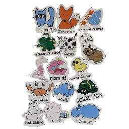 this sticker line was called "toadily cool animals" by david and goliath, and are dated 2003! all are in perfect condition. :) they slightly differ in size but they are all around 3".